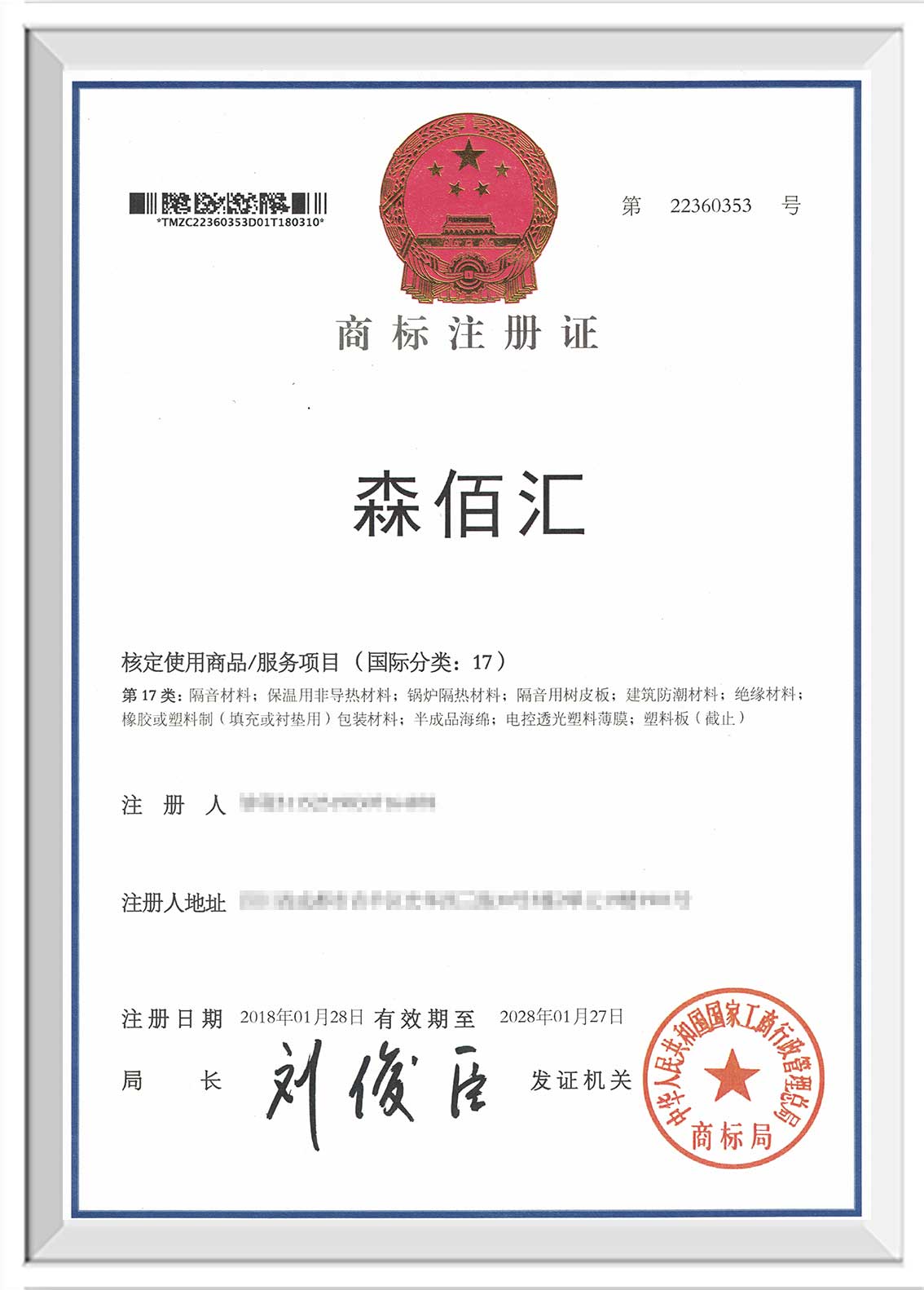 湖北“森佰汇”商标证书下发至企业